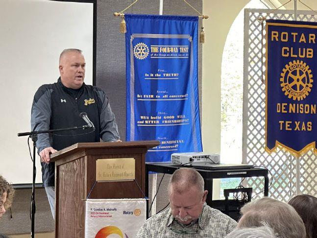 DHS powerlifting coach spoke to the Denison Rotary Club Thursday and took time to answer questions from the group. Bigelow explained how student lifters are placed in competition categories based on how much they weigh, not by how much they can lift. Photo Credit: courtesy photo / DISD