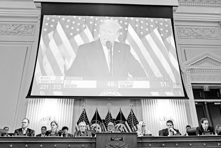 A video exhibit plays as the House select committee investigating the Jan. 6 attack on the U.S. Capitol continues to reveal its findings of a year-long investigation, at the Capitol in Washington, Monday, June 13, 2022. AP Photo/Susan Walsh