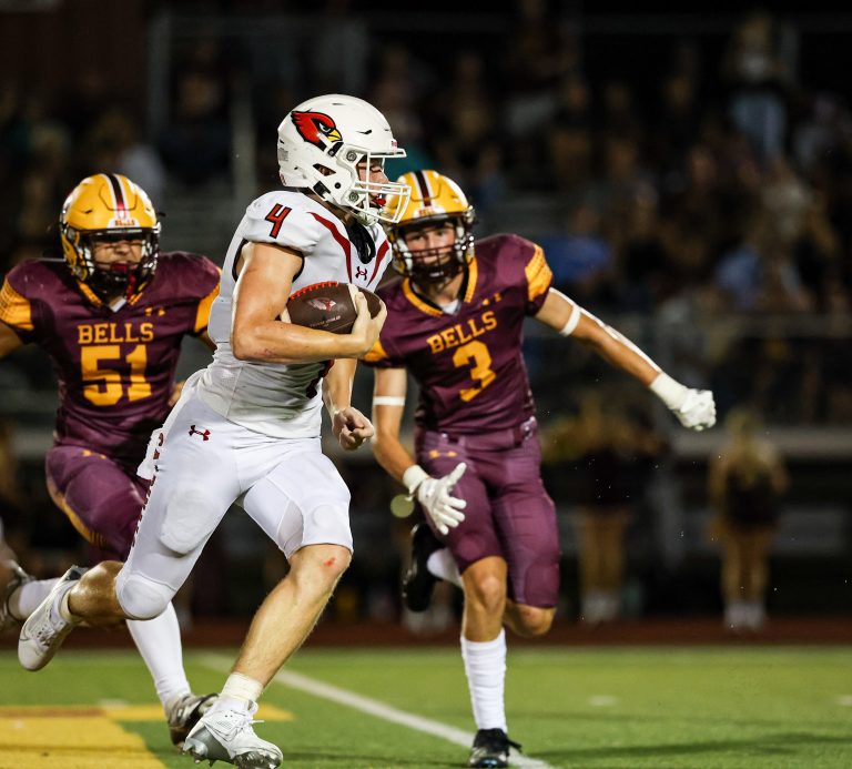 Pottsboro's Cayden Humphrey ran for three touchdowns and also threw for a score in the Cardinals' win against Bells. Lillian De Leon / For The Herald Democrat