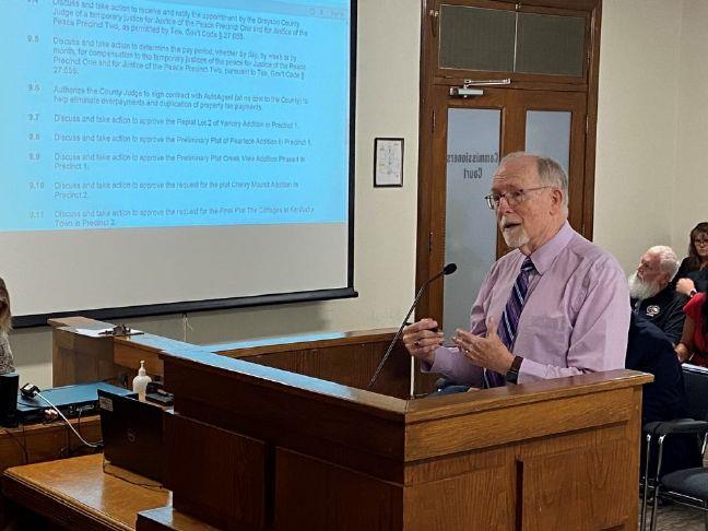 Grayson County Tax Assessor Bruce Stidham speaks before the Grayson County commissioners in 2024. This week, Stidham spoke before the group about a planned office closure to take place May 20 through June 3. Photo Credit: Jerrie Whiteley / Herald Democrat
